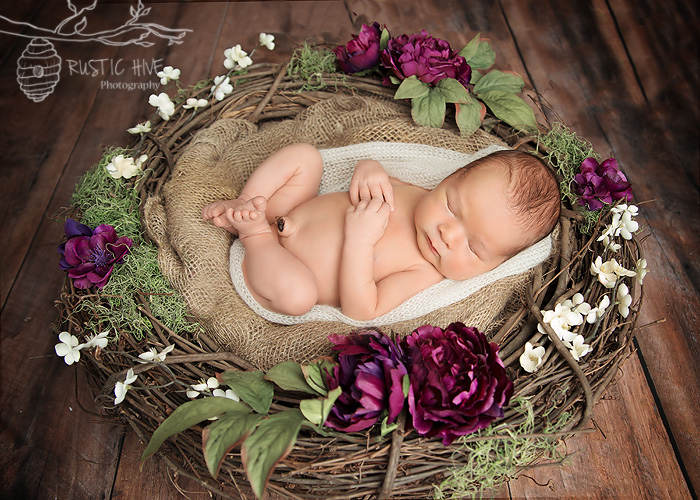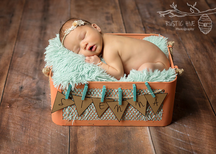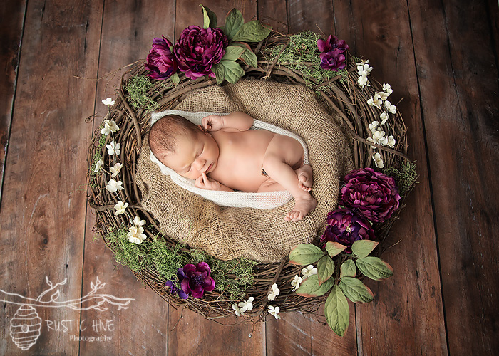 This was my second session with lovely Sienna. First was the fresh 48 and this was her posed session at the Rustic Hive Studio. Mom brought in the beautiful wreath to incorporate and I loved the custom little banner I made for the basket.